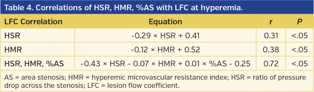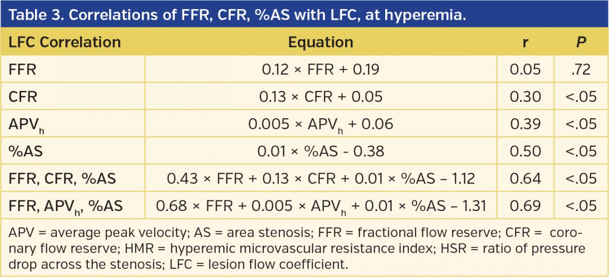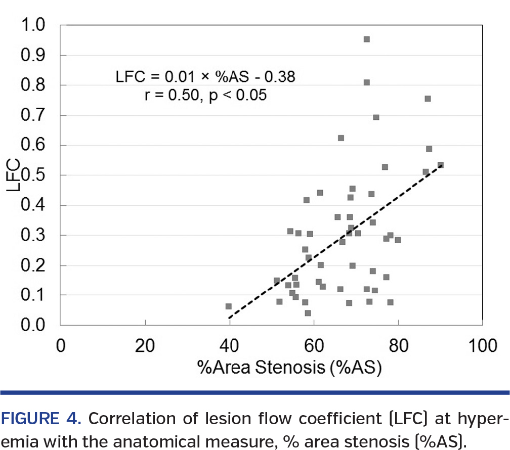 Correlation of hyperemic LFC with FFR, CFR, APVh, and %AS. The correlation equations along with regression coefficients (r-values) and the P-values obtained using the regression analysis of hyperemic LFC with FFR, CFR, APVh, and %AS are summarized in Table 3. Pressure-based FFR showed an insignificant (P=.72) linear correlation with LFC and the r-value was low (r = 0.05). When the LFC was correlated with the flow-based parameter CFR, the r-value significantly improved to 0.30 (P<.05). Similarly, LFC correlated significantly with hyperemic velocity, APVh (r = 0.39; P<.05). When LFC was correlated with the anatomical measure %AS, there was a significant correlation (P<.05) with an improved r–value of 0.50 (Figure 4).