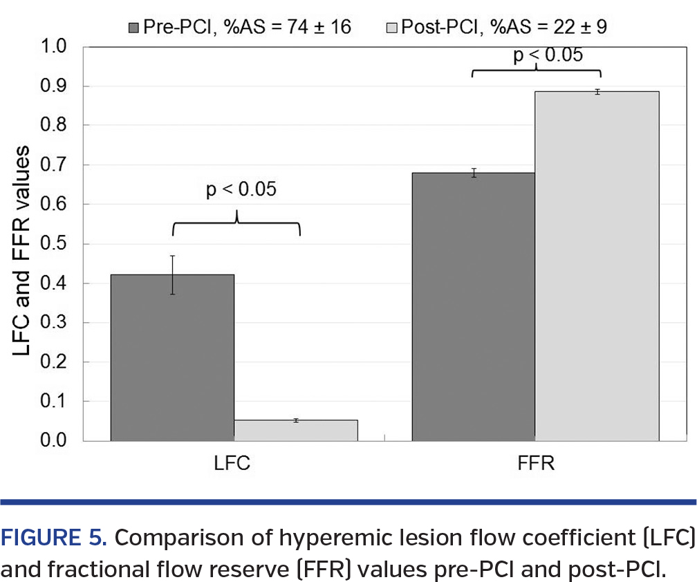 Hyperemic LFC variation pre-PCI and post-PCI. Based on the clinical indications for PCI of moderate lesions, we had a subset of 5 corresponding pre-PCI and post-PCI datapoints within the studied patient population. A comparison of mean FFR and LFC values between these two groups is presented in Figure 5. The mean values of %AS before PCI (74 ± 16%) and after PCI (22 ± 9%) were significantly different (P<.05). Correspondingly, the FFR values significantly increased from a pre-PCI value of 0.68 ± 0.01 to 0.88 ± 0.04 after PCI. The LFC value significantly decreased from 0.42 ± 0.05 before PCI to a value of 0.05 ± 0.004 after PCI. These values demonstrate a general trend of higher LFC values for a higher %AS and relatively decreased LFC values as the %AS decreases. Thus, the trend of LFC is opposite to FFR in relation to %AS. These initial data will be further augmented in the future using a larger sample size.
