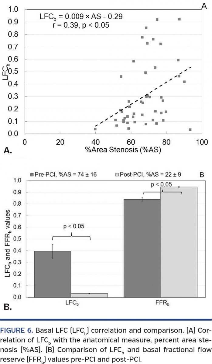 In addition to the correlations, pre-PCI and post-PCI comparisons for LFCb were also performed. These results are presented in Figure 6B. The mean LFCb value significantly decreased from 0.39 ± 0.06 to 0.03 ± 0.02 for the pre-PCI and post-PCI groups, respectively (P<.05). The mean FFRb values for the pre-PCI (0.84 ± 0.02) and post-PCI (0.94 ± 0.003) groups were also significantly different (P<.05). However, the percent decrease ([pre-PCI value – post-PCI value]/[pre-PCI value]) for LFCb was 92%, while the percent increase ([post-PCI value – pre-PCI value]/[post-PCI value])in FFRb was 10.6%. Thus, LFCb showed a wider variation between pre-PCI and post-PCI groups in comparison with FFRb. Furthermore, similar to LFC at hyperemia, LFCb also had an increasing trend with an increase in %AS.