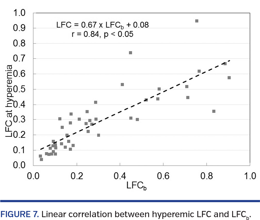 Due to the recent interest in vasodilator-free assessment of stenosis severity, we also assessed the LFC at baseline conditions. Present results showed that the LFCb, similar to the hyperemic LFC, showed significant correlations when FFRb, APVb, and %AS were combined and HSRb, HMRb, and %AS were combined. In addition, LFCb showed a wider variation in comparison to FFRb between the pre-PCI and post-PCI groups. Furthermore, the hyperemic LFC and LFCb had a strong linear correlation (Figure 7) (r = 0.84) that was statistically significant (P<.05). Thus, LFC depends less critically on the extent of hyperemia and can be applicable for vasodilator-free stenosis evaluation.