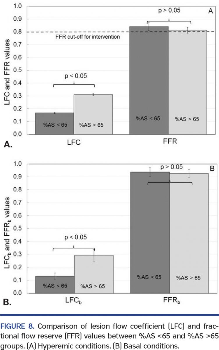LFC corresponding to %AS cut-off. We also performed comparisons between hyperemic LFC and FFR values using a %AS cut-off of 65%. This was based on the reasoning that 65% area stenosis (or 40% diameter stenosis) was representative of the intermediate range of stenosis.51 The P-values were obtained using ANOVA analysis with SAS software. Similar comparisons were performed for the basal parameters LFCb and FFRb. Figure 8 summarizes the results of these comparisons. LFC values significantly increased from 0.17 ± 0.004 for the %AS <65% group to 0.31 ± 0.007 for the %AS >65% group (P<.05) (Figure 8A). Under baseline conditions, a similarly significant increase in LFCb values was observed (%AS <65%, 0.13 ± 0.02 and %AS >65%, 0.29 ± 0.05) (Figure 8B). On the other hand, the hyperemic FFR values decreased insignificantly (Figure 8A) from a value of 0.84 ± 0.03 for the %AS <65% group to a value of 0.81 ± 0.02 for the %AS >65% group (P>.05).52,53 Similarly, the FFRb values decreased insignificantly from a value of 0.94 ± 0.04 for the %AS <65% group to a value of 0.93 ± 0.03 for the %AS >65% group (P>.05) (Figure 8B). Therefore, LFC was able to distinguish the tested %AS groups under both hyperemic and basal conditions, whereas the FFR was unable to distinguish between the tested %AS groups.