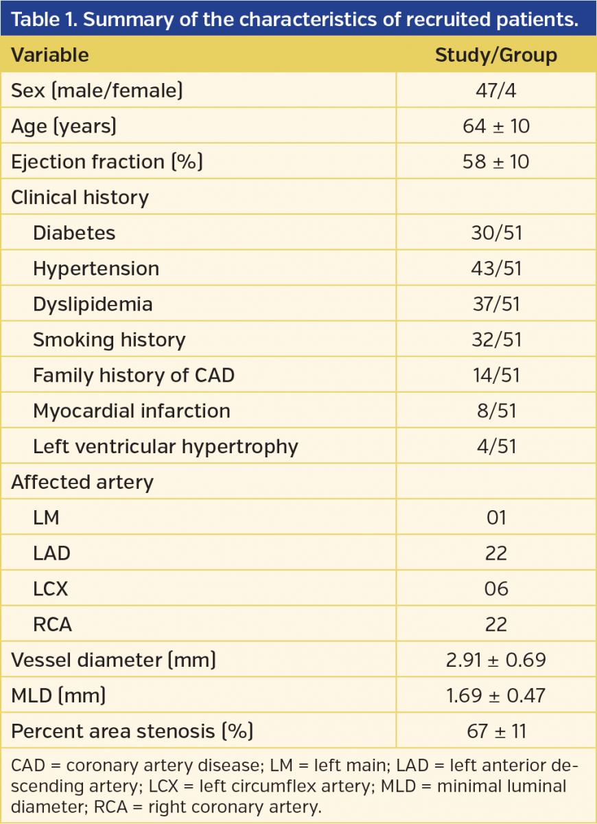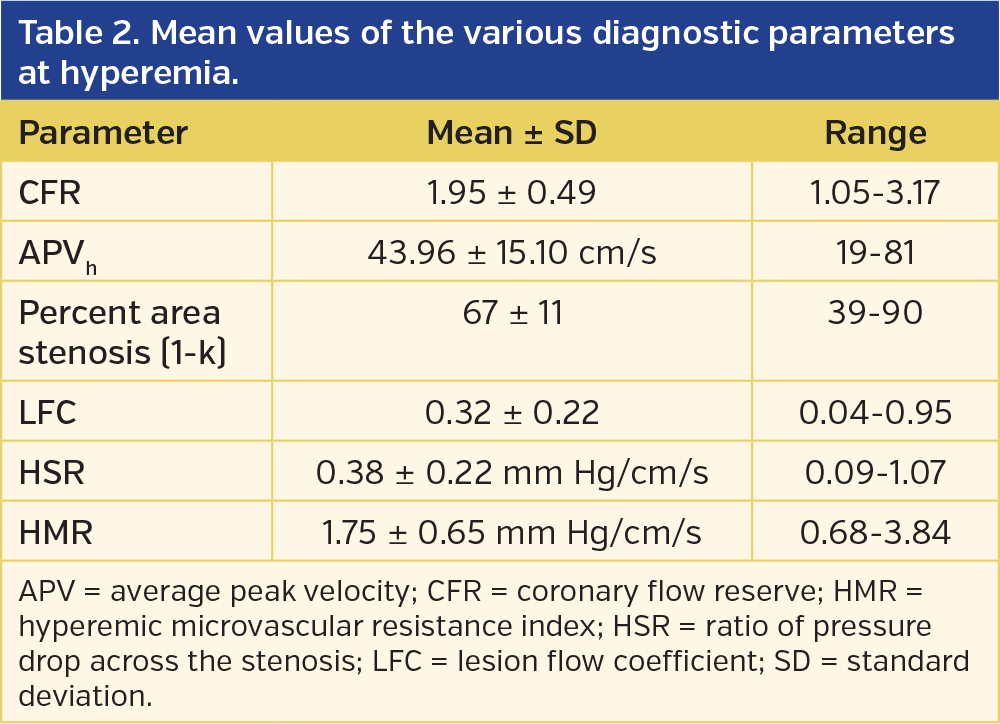 Patient history, demographics, targeted coronary arteries, the average and minimal luminal diameter and %AS of vessels for the 51 datapoints are presented in Table 1. Similarly, the mean values of the diagnostic parameters, CFR, FFR, APVh, %AS, LFC, HSR and HMR, along with their corresponding ranges are reported in Table 2. The correlation of hyperemic parameters, LFC with FFR, CFR, APVh, and %AS are reported in Table 3. The correlations with hyperemic HSR and HMR are presented in Table 4 and are discussed subsequently.