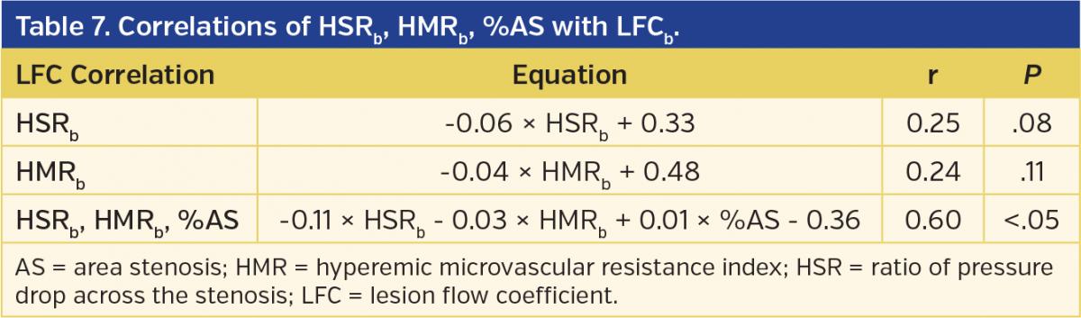 Statistical analysis. Fifty-one datapoints were obtained from 49 patients. The LFC values obtained using the above-mentioned formula are first correlated with the pressure parameter (FFR), flow parameters (CFR and APVh), and anatomical data (%AS). Since LFC combines anatomical data (%AS) with pressure and flow data, it was correlated with FFR, CFR, and %AS in combination as well as FFR, APVh, and %AS in combination. Similarly, it was correlated individually with HSR and HMR, and in combination with %AS. Furthermore, a non-parametric Kruskal-Wallis ANOVA test was used to compare the mean values of the pre-PCI and post-PCI data in 5 vessels.