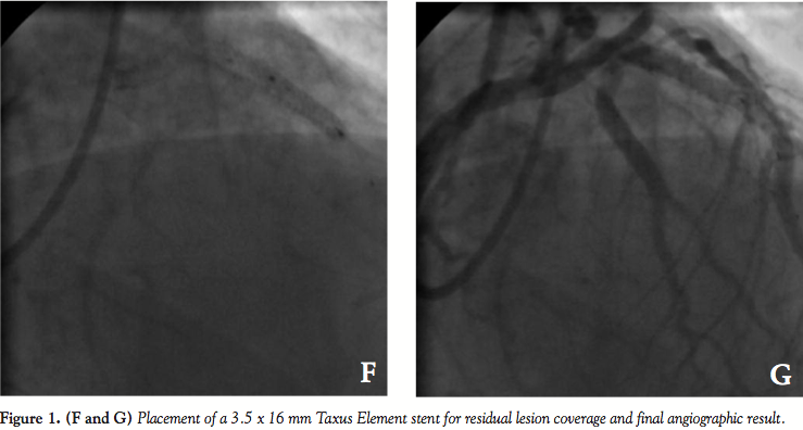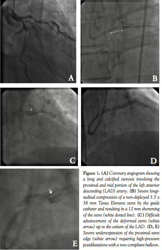 length by approximately 12 mm before deployment (Figure 1B). Due to this major proximal stent deformation, the operator failed to recapture the stent into the guide catheter. Subsequently, it became difficult to advance the balloon with the compressed stent from the LM into the LAD. After careful manipulation, the proximal edge of the stent could be placed at the ostium of the LAD, but the distal part of the lesion was not covered (Figures 1C and 1D). After stent deployment, the angiography showed a concentrated mass of unapposed struts at the proximal edge of the stent (Figure 1E). Postdilatation was performed at high pressure with a 3.5 mm non-compliant balloon and a 3 x 12 mm Taxus Element stent was placed on the residual LAD lesion. The final angiographic result was deemed acceptable (Figure 1F) and the patient remained well throughout the 8-month clinical follow-up.