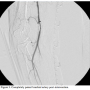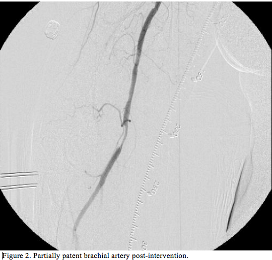 The next morning, the patient developed severe pain and discoloration of her right upper extremity. Physical examination revealed diminished right brachial and absent radial pulses. Emergency catheterization was performed through right common femoral artery, and showed 100% occlusion of the right brachial artery. We crossed the lesion with a 0.014˝ wire and performed multiple angioplasties with a 2.5 x 120 mm balloon at 4 atm. We delivered 8 mg of tPA through a 4 Fr Glide catheter (Terumo) with repeated angioplasties through a 2.5 x 20 mm balloon at 8 atm with lesion reduction from 100% to less than 20% and TIMI flow improvement from 0 preintervention to 3 postintervention. Postprocedure, the patient was kept on heparin infusion for 24 hours. She was discharged the following day on dual-