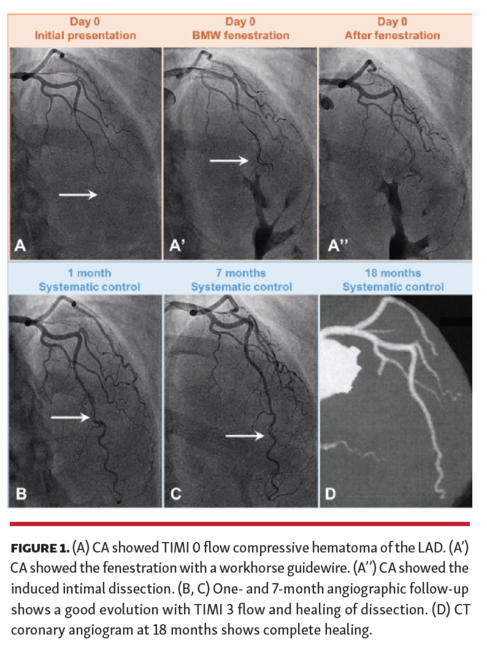 This could be a bailout strategy in the event of (1) failure to reach the distal true lumen; (2) slight improvement in the distal flow, but allowing clinical resolution of ST-segment elevation myocardial infarction; and (3) a situation not suited to surgery. Here, this “prick-and-wait” technique led to a complete recovery only with a BMW guidewire and time.