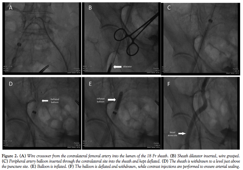 Despite the preventive use of a peripheral vessel balloon in all patients, we believe that applying that technique for vessel closure could potentially be cost effective. The minimization of vascular complications such as rupture, perforation or hematoma renders the likelihood of using further rescue devices rather distant. Moreover, by wedging the wire with the sheath dilatator in the contralateral site, we avoid the use of further longer sheaths and extra back-up catheters.