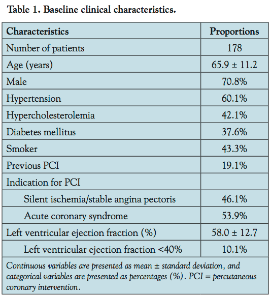 The primary endpoint was 1-year target lesion failure (TLF), defined as the composite of cardiac death, MI, or ischemia-driven target lesion revascularization (TLR). Deaths were classified as either cardiac or non-cardiac. Death was considered cardiac unless an undisputed non-cardiac cause was identified. Myocardial infarction was diagnosed by the presence of ischemic symptoms or signs plus new significant Q waves on the electrocardiogram and/or elevation of cardiac enzymes (creatine kinase-MB elevation >3x or creatine kinase elevation >2x the upper limit of normal). Ischemia-driven TLR was defined as repeat revascularization with either PCI or CABG because of restenosis within the stent or in the 5 mm distal or proximal segments because of clinical or functional ischemia. Stent thrombosis was defined according to Academic Research Consortium criteria.21 Definite stent thrombosis occurred if angiographic or pathologic evidence of stent thrombosis occurred. Probable stent thrombosis occurred if death within 30 days of PCI or MI at any time attributable to the target vessel occurred.