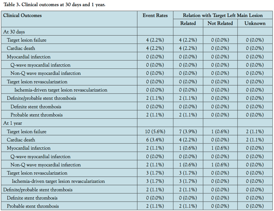 Abstract: Objective. The aim of this study was to assess the clinical outcomes of percutaneous coronary intervention (PCI) with everolimus-eluting stents (EES) for the treatment of unprotected left main coronary artery (ULMCA) disease. Background. The standard of care for the treatment of ULMCA disease is coronary artery bypass grafting (CABG). Data suggest that PCI with drug-eluting stents is a viable alternative to CABG for the treatment of ULMCA disease. Randomized trials demonstrated superior event-free survival with EES compared with paclitaxel-eluting stents in non-ULMCA lesions. However, data with ULMCA PCI with EES are limited. Methods. This multicenter international registry included 178 patients from the United States, South Korea, and Italy who underwent ULMCA PCI with EES from 2008 to 2010. The primary endpoint was freedom from target lesion failure (TLF), defined as cardiac death, myocardial infarction (MI), and ischemia-driven target lesion revascularization (TLR) at 1 year. Results. At 30 days, 4 patients (2.2%) died from cardiac causes, and no patient experienced MI or TLR. One-year freedom from TLF was 94.4%. One-year freedom from cardiac death, MI, and ischemia-driven TLR was 96.6%, 98.9%, and 98.3%, respectively. Two patients (1.1%) had definite or probable stent thrombosis. Conclusion. PCI with EES is safe and effective and may be a viable option for the treatment of ULMCA disease.