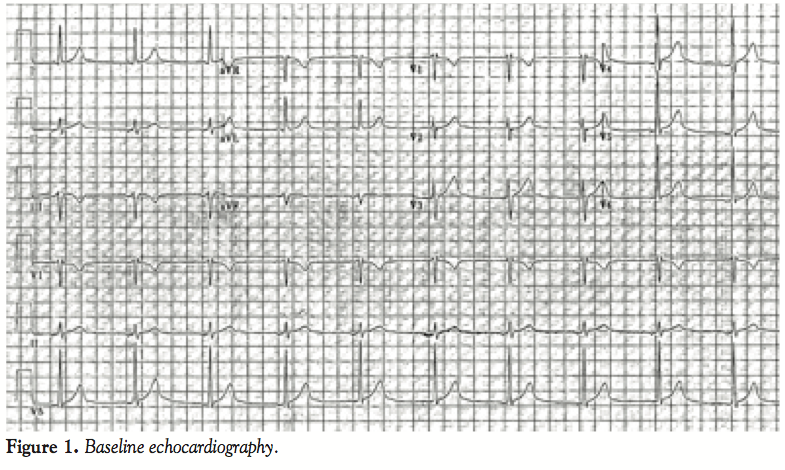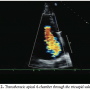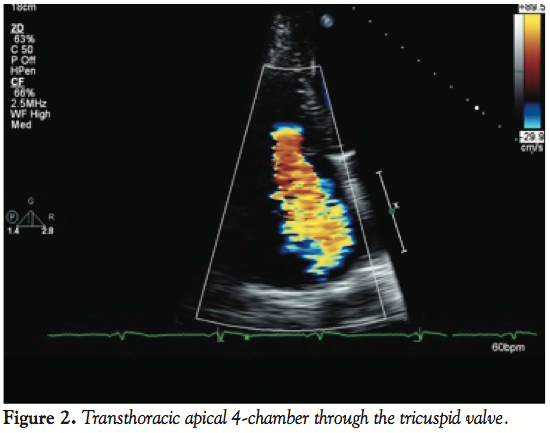mild shortness of breath. Later that evening, he visited the office of a relative who was a community cardiologist. An EKG demonstrated diminutive R waves in III and aVF, and T-wave inversions in the same leads. There were no ST-T wave segment changes (Figure 1). A transthoracic echocardiogram in the office demonstrated severe tricuspid regurgitation (Figure 2). The patient was directly admitted to the hospital for further cardiac evaluation.