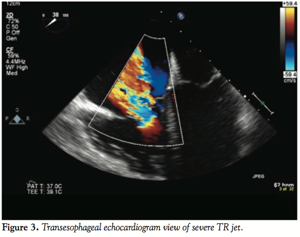 On arrival to the emergency room, vitals were normal; blood pressure was 132/84 and pulse was 63 bpm. A III/VI systolic murmur was noted in the left sternal border. Lungs were clear to auscultation, and the remainder of the exam was normal. The patient underwent a transesophageal echocardiogram (TEE) to evaluate the severity and mechanism of the regurgitant lesion. The TEE revealed moderate right ventricle (RV) dilatation and a distinct akinetic anterior wall of the RV. The severe tricuspid regurgitation was due to tethering of the leaflets, secondary to the underlying wall motion abnormality (Figure 3). The wall motion in other regions was preserved and there were no other accompanying valvular abnormalities.