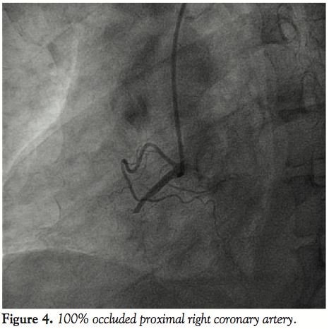 Based on the TEE findings, the patient was referred for cardiac catheterization. The patient was found to have 100% occlusion of the proximal right coronary artery (Figure 4), and subsequently underwent successful restoration of flow with a drug-eluting stent. Follow-up echocardiography 6 months later showed the severity of tricuspid regurgitation had decreased (moderate); however, the RV remained moderately hypokinetic and mildly dilated.