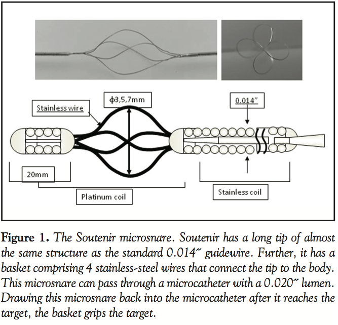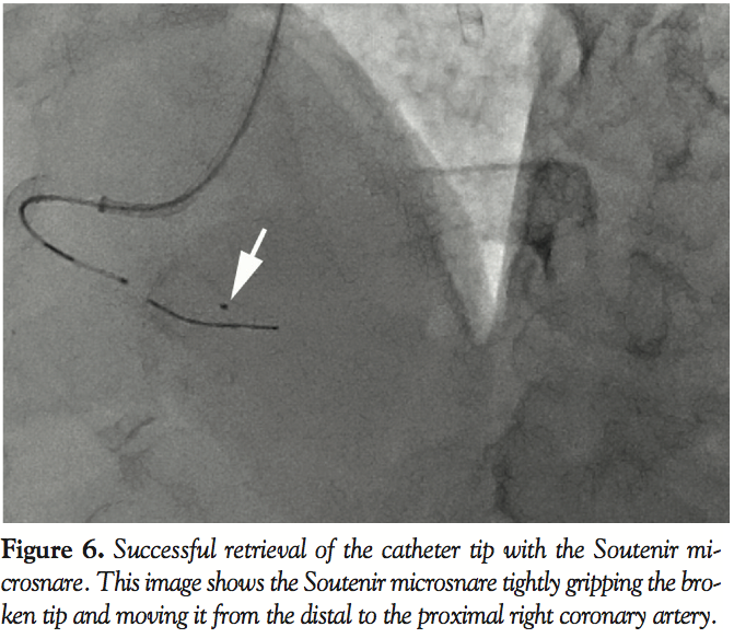 Discussion. In this case report, we introduce the use of the novel microsnare, Soutenir, for retrieving the tip of a broken catheter from the distal coronary artery. Recently, retrograde wire manipulation became a very important technique to treat occluded coronary arteries.3 Soutenir was used to hold and pull the guidewire through lesions in the distal or middle part of the coronary artery during retrograde CTO manipulation.2 Soutenir has a long tip, with which it can easily be advanced through a specific branch of the coronary artery. Furthermore, one can select the size of the Soutenir basket (3, 5, or 7 mm) according to the size of the selected branch of the coronary artery. The Soutenir basket can expand to a size similar to that of the target coronary artery branch; hence, the Soutenir is better able to pull the guidewire than other retrieval devices.