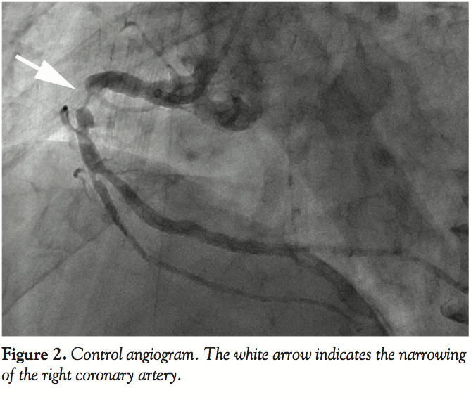 Case Report. A 64-year-old man was referred to our hospital with exertional chest pain. An angiogram showed severe narrowing of the proximal RCA (Figure 2). We decided to perform PCI, and the patient was administered antiplatelet agents. A 6 French (Fr) guide catheter (JR 4.0) was advanced into the RCA via the right radial artery. A 0.014˝ guidewire easily passed through the narrowed artery and entered the atrioventricular (AV) branch. IVUS was performed to evaluate the plaque characteristics. The IVUS catheter passed through the lesion with some difficulty.