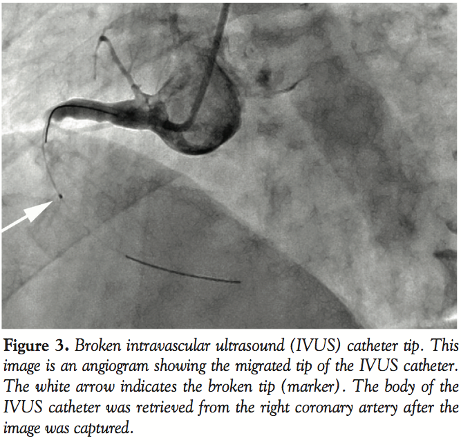 ABSTRACT: Soutenir (Asahi-Intecc, Nagoya, Japan), a novel microsnare, was used to grip and pull a retrograde guidewire through arteries with chronic total occlusions during percutaneous coronary intervention (PCI). Soutenir can pass through a microcatheter with a 0.020˝ lumen, and it can easily enter distal lesions in the coronary artery. Here, we introduce a method for retrieving the tip of a broken intravascular ultrasound (IVUS) catheter by using this microsnare. We present the case of a 64-year-old man who was referred to our hospital for narrowing of the proximal right coronary artery (RCA). After IVUS examination, the catheter was removed from the artery with some difficulty, and the catheter tip broke. The broken tip remained in the RCA and was carried along with the blood to the distal part of the RCA. The conventional gooseneck snare and filter device failed to retrieve the broken tip. However, Soutenir easily passed beyond the catheter tip and reached the distal part of the atrioventricular branch. It snared the tip of the catheter, whereby the tip could easily be removed. Thus, without damaging the RCA, we successfully removed the broken catheter tip from the RCA using this microsnare.