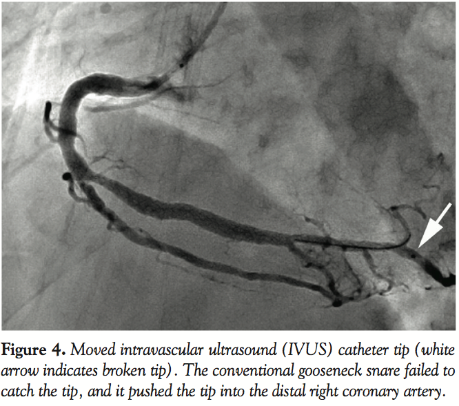 In the present case, the conventional gooseneck snare failed to capture the broken catheter tip remaining in the RCA. Some studies have shown the efficacy of the conventional gooseneck snare in the retrieval of migrated stents in the proximal coronary artery.4,5 However, in our study, delivering a gooseneck snare to the distal RCA was difficult. Moreover, on reaching the broken tip, the snare was unable to capture it and in fact pushed the tip further into the artery. The other devices we used in this study easily entered the distal RCA; this is because they had longer tips than the gooseneck snare, which helped them enter the arteries.