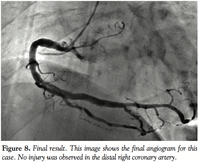 We then used a filter device that passed through the broken tip and succeeded in returning it to the middle of the RCA; however, the filter was unable to remove the tip out of the artery because it had entered the space on a side of the broken tip. Hence, although the filter reached the tip, it could not capture it (Figure 5). Thus, we selected the Soutenir device to remove the tip. First, the microcatheter, which had a 0.020˝ lumen, advanced into the AV branch with the conventional guidewire. The Soutenir easily passed through the microcatheter and reached the distal AV branch. The Soutenir basket remained in the microcatheter during its advancement through the RCA; however, on reaching the distal AV branch, the basket protruded out from the microcatheter. Using the basket, we very gently pulled the Soutenir microsnare out of the right ventricular branch. It had successfully captured the broken catheter tip, and the snare along with the retrieved catheter tip was easily drawn out through the guide catheter (Figures 6 and 7). A final angiogram showed that the procedure caused no injury to the distal RCA (Figure 8).