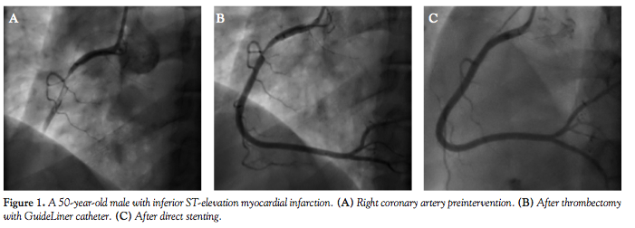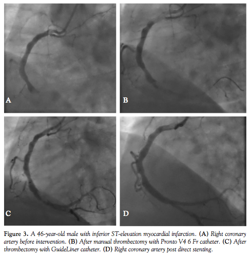 Care was taken to prevent distal and proximal embolization periprocedurally that would be detrimental to a successful outcome. Continuous aspiration during withdrawal of the GuideLiner catheter is of utmost importance, as the ability to aspirate larger thrombus fragments does lend to a higher risk of significant embolic events with thrombus dislodgment. The stoppage of aspiration during continuous vacuum suction would imply the presence of thrombus fragment occluding at the distal tip or in the body of the catheter, and utmost care needs to be taken at this point to avoid thrombus dislodgment. Avoidance of additional balloon dilatation either before or after stenting was utilized to avoid shearing clot with resultant distal embolization. No cases of stroke occurred in this case series. A recent meta-analysis of randomized trials of thrombectomy in primary PCI did show a trend to a higher stroke rate, with no time to event occurrence reported.18