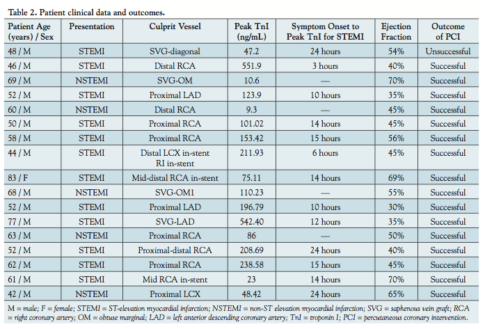 All angiographic data were reviewed and clinical data were obtained from retrospective chart review. Troponin I testing was performed post procedurally every 6 hours for the first 48 hours of admission. Electrocardiogram (ECG) was performed daily until discharge or if symptoms of ischemia or instability occurred in hospital.