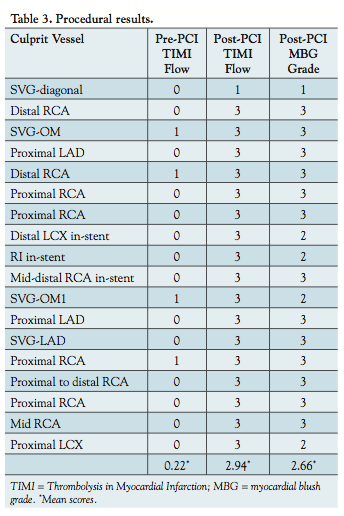Successful outcomes as judged by symptom resolution, improvement in ST-segments, and obtaining brisk Thrombolysis in Myocardial Infarction (TIMI)-3 flow occurred in 17/18 vessels treated. Myocardial blush grade (MBG) of 2 or greater was achieved in 94.4% of patients undergoing PCI with manual aspiration (Table 3). A single case of an acutely occluded SVG that was thrombus laden proximal to distal had an unsuccessful outcome. Initial aspiration with the Pronto catheter in 3 cases and the Export catheter in 1 case was unsuccessful (Figure 3B). Subsequent use of the guide extension catheter provided a successful outcome with thrombus aspiration (Figures 3C and 3D). In 1 case involving the LCX artery, delivery of the GuideLiner to the lesion was unsuccessful and aspiration was performed proximal to the lesion with direct stenting of the lesion with a successful outcome noted both clinically and by angiography.
