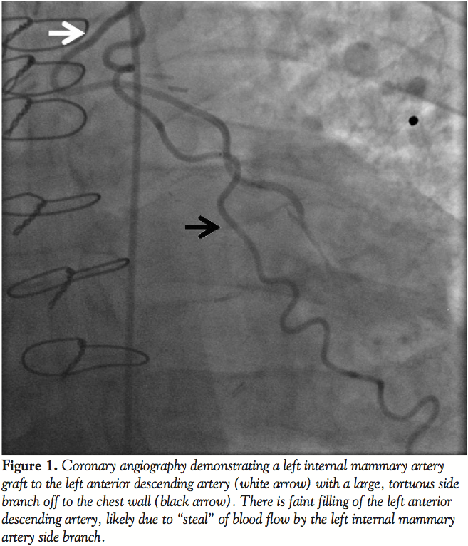 Case Report. A 60-year-old man with a history of diabetes mellitus, hypertension, and paroxysmal atrial fibrillation, presented with angina in spite of intensive antianginal medical therapy. A stress test demonstrated anterior ischemia. He had undergone CABG 7 years prior to presentation with implantation of a LIMA to the left anterior descending artery (LAD) and 2 saphenous vein grafts (SVG) to the posterior descending artery and the second obtuse marginal artery. Although angina improved after CABG, he continued to have exertional chest pain that subsequently worsened. Coronary angiography revealed that all bypass grafts were patent. The LIMA to LAD had a large side branch (Figure 1). In view of the severity of the patient’s symptoms and the lack of other possible culprit lesions, percutaneous occlusion of the LIMA side branch was planned.