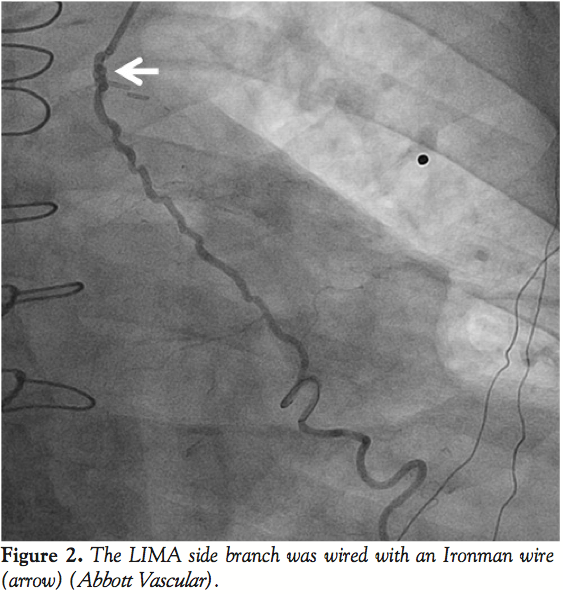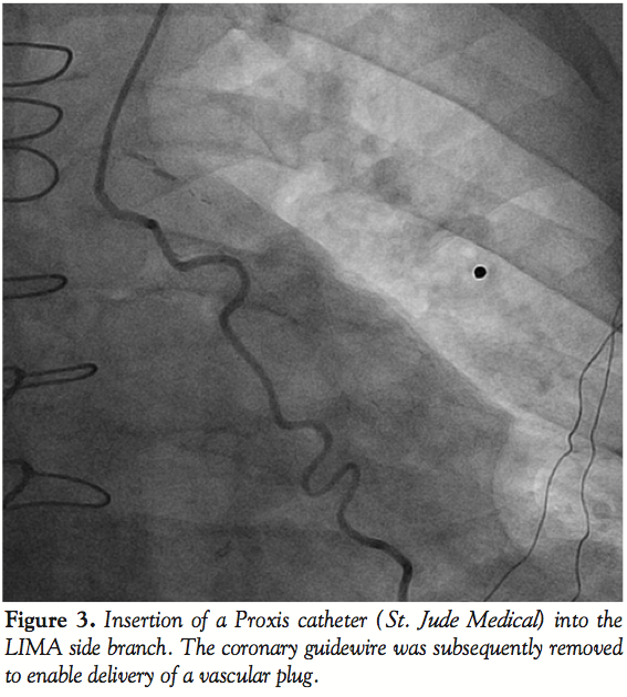 Left radial access was obtained with a 6 Fr sheath. The LIMA was wired with an Ironman wire (Abbott Vascular; Figure 2) and a Proxis catheter (St. Jude Medical) was inserted into the LIMA side branch (Figure 3). We attempted to deliver a 3 mm Amplatzer vascular plug (AGA Medical) through the Proxis catheter in the LIMA side branch, however significant resistance was encountered during delivery attempts. The device was partially deployed but in suboptimal location due to movement of the catheter during delivery. The vascular plug was recaptured and removed. LIMA angiography demonstrated side-branch occlusion. The LIMA side branch remained occluded after 15 minutes of observation. The patient had an uneventful recovery and has had no recurrent angina during 3 months of follow-up.
