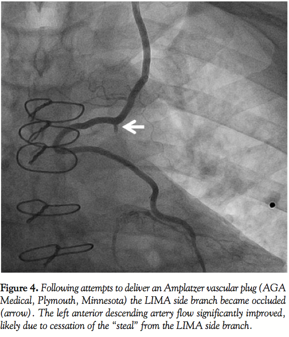 Several techniques have been used to occlude a LIMA side branch. Guzon et al9 reviewed the methods utilized in the treatment of 42 patients presenting with angina post-CABG, presumably due to coronary steal. While the majority received percutaneous closure of the LIMA side branch, surgical closure of the side branch with either direct ligation or surgical clipping was utilized in 11 patients. Percutaneous closure is still preferred as it can be achieved with shorter hospitalization, lower cost, and lower procedural risk.10