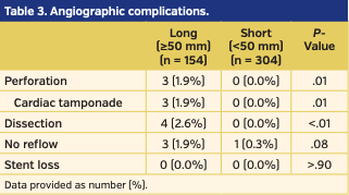 Procedural results. The long-stent group had higher rates of perforation (1.9% vs 0%; P=.01) and dissection (2.6% vs 0%; P<.01). The rate of no-reflow was non-significantly higher in the long-stent group (1.9% vs 0.3%; P=.08). No stents were lost in either group.