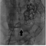 Shortly after arrival at our institution, the patient became hypotensive and required intravenous vasopressor support. His central venous pressure increased from 10 to 40 cm water, and the decision was made to proceed with emergent endovascular repair. A 28.5 x 14.5 x 18 cm Gore endovascular covered stent (W.L. Gore, Newark Deleware) was deployed, but was unsuccessful at creating a proximal seal with the infrarenal aorta. The patient remained hemodynamically unstable, and the decision was made to convert to an aorto-uniliac system using a series of Zenith devices (Cook Medical, Inc., Bloomington, Indiana) overlapping from the aorta to the right iliac artery. After deployment of the aorto-uniliac system the patient rapidly became hemodynamically stable, and his CVP normalized. A 24 mm x 30 mm occlusion plug was deployed at the origin of the left common iliac artery, and a femoral-femoral bypass performed using a 10-mm PTFE graft.