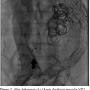 The follow-up CT scan on hospital day 9 demonstrated a large type 2 endoleak which communicated with the IVC through the aortocaval fistula. The flow through the aortocaval fistula was substantially reduced from prior study. Surgical closure of the aortocaval fistula was considered, but the patient was felt to be a high-risk operative candidate, and a percutaneous approach was pursued. On hospital day 13, the patient was taken to the cardiac catheterization lab and underwent coil embolization to the aneurysmal sac. Using fluoroscopic guidance, a 14-mm Amplatzer muscular ventricular septal defect (VSD) occluder device (AGA Medical, Plymouth, Minnesota) was successfully deployed across the aortocaval fistula (Figures 1 and 2). With contrast injection in the IVC, there was minimal opacification of the VSD occluder after deployment. Coil embolization of the inferior mesenteric artery was subsequently performed by interventional radiology, with resolution of the Type 2 Endoleak. Follow-up CT scan revealed no evidence of endoleak, and stable position of the VSD occluder device with no flow visualized across the aortocaval fistula. The patient was discharged to a rehabilitation facility for physical therapy.