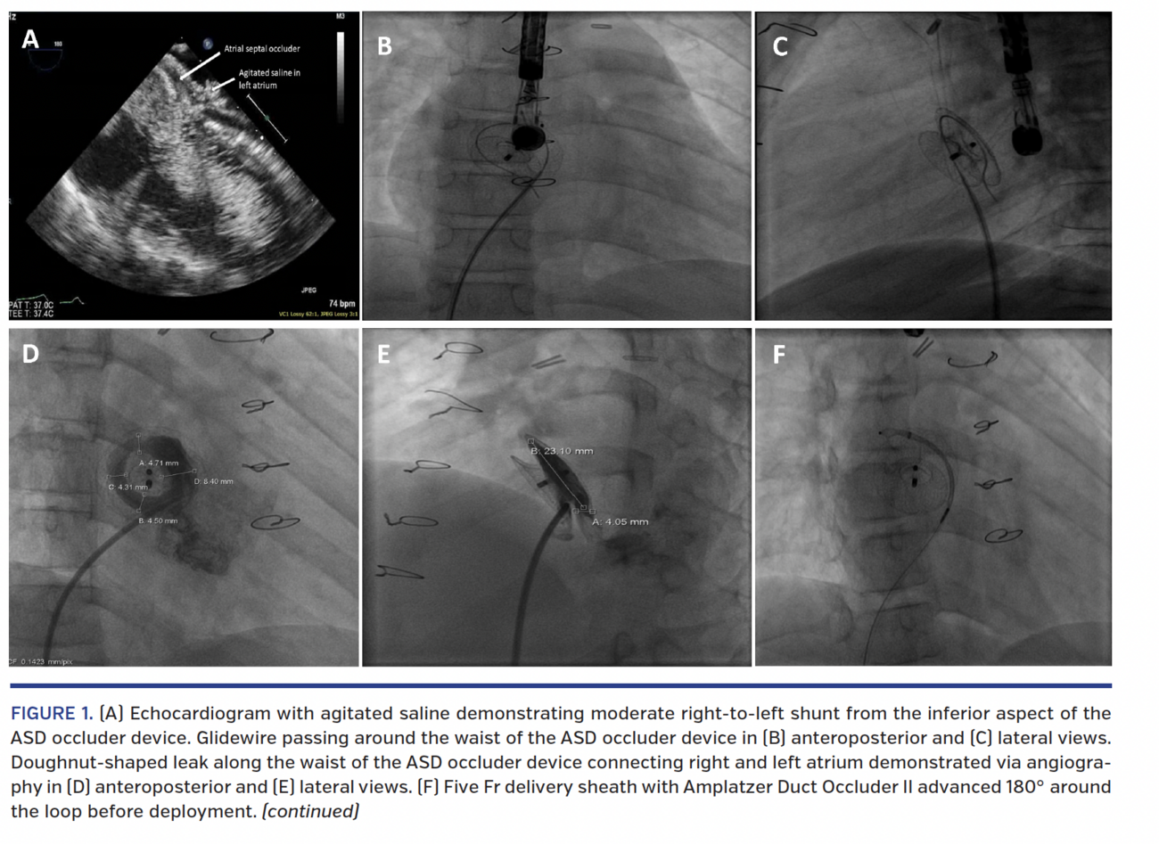 A 10-year-old girl with pulmonary atresia status post transannular patch repair and secundum atrial septal defect (ASD) underwent percutaneous ASD closure with 14 mm Amplatzer ASD occluder (ASDO; Abbott Vascular) at the age of 5 years. There was improvement in arterial saturation from 86% to 98% with minimal residual right-to-left shunt. She subsequently developed recurrent migraines despite medical therapy. Echocardiogram with agitated saline (EAS) demonstrated moderate residual right-to-left shunt from the inferior aspect of the ASDO (Figure 1A). After extensive discussion, we elected to pursue percutaneous closure of the right-to-left shunt due to her recurrent migraines.