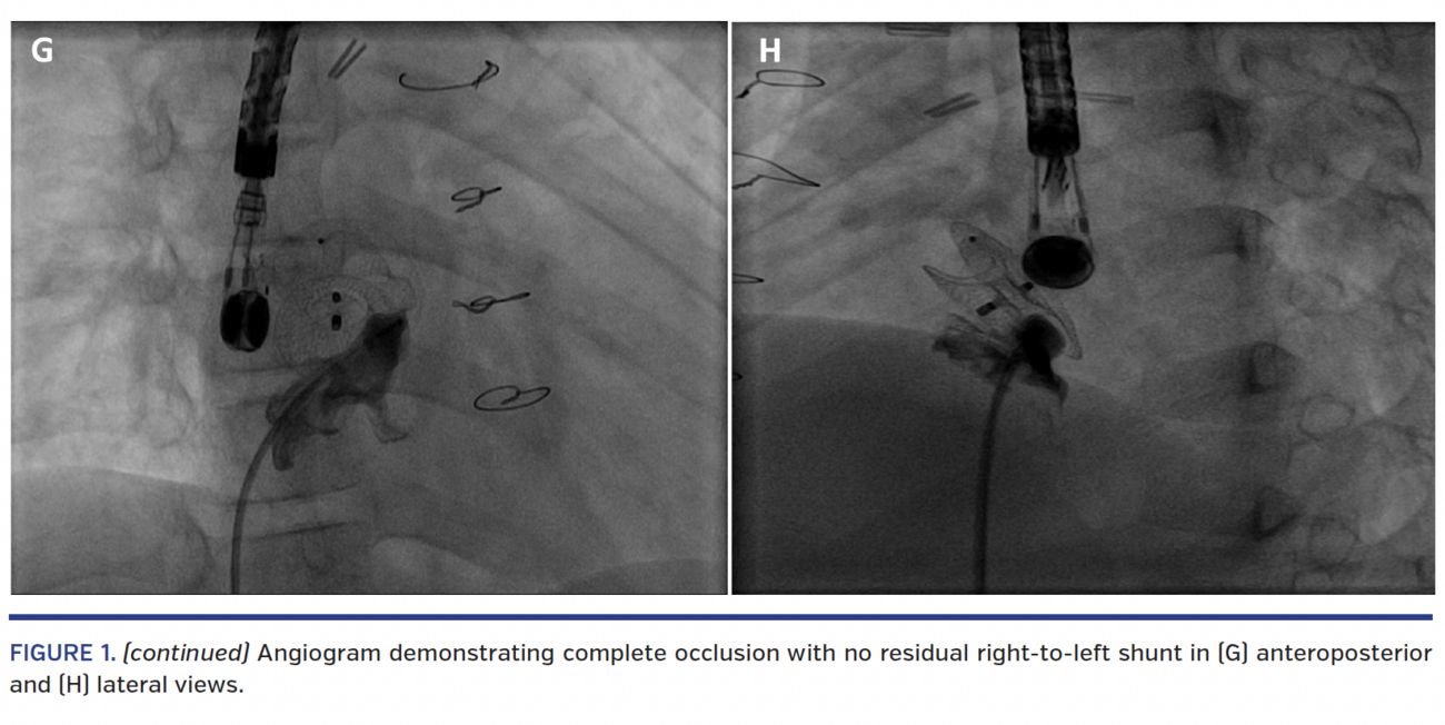 Cardiac catheterization was performed via femoral approach and revealed a right atrial pressure of 10 mm Hg with a pulmonary to systemic blood flow ratio of 0.9. Multiple attempts were made to advance wires into the left atrium along the ASDO without success. However, each wire passed around the waist of the ASDO in a circular fashion (Figures 1B and 1C; Video 1). After advancing the wedge catheter along the wire, angiography revealed a “doughnut-shaped” leak in a 360° loop along the waist of the ASDO connecting the right and left atrium (Figures 1D and 1E; Video 2). We elected to close this channel using a 6 x 6 mm Amplatzer Duct Occluder II (ADO2). A Glidewire (Terumo Medical) was advanced along the waist into the left atrium and the Glide catheter (Terumo Medical) was advanced into the left atrium. Several wires were used to secure the position; however, we could not advance the 5 Fr Flexor delivery sheath (Cook Medical) across the full loop due to high tortuosity within the ASDO. Therefore we advanced the ADO2 180° around the loop and deployed the device (Figure 1F; Video 2). Repeat angiogram showed complete occlusion with no right-to-left shunt (Figures 1G and 1H; Video 2). The device was released and repeat EAS confirmed no residual shunt. The patient subsequently had near complete resolution of her migraines.