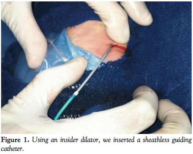 In this case a sheathless technique was shown. The sheathless catheter has already been shown as safe in small case series and in a multicenter registry.4-6 With a smaller luminal diameter than that of traditional sheath systems, the risk of vasospasm, vascular damage, radial artery occlusion, and bleeding complications, even in maximal platelet inhibition, is theoretically reduced.7