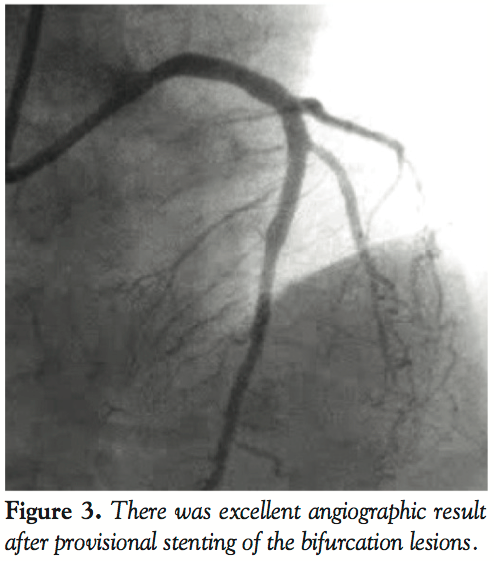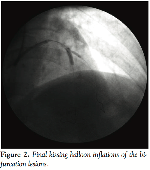cook Flexor sheath (Cook) as inside dilator in a 7 Fr EBU 3.5 guiding catheter (Medtronic Medical) (Figure 1). The LAD/diagonal bifurcation lesions were treated with a 3.5 mm x 15 mm Promus stent (Boston Scientific) and kissing balloon inflations of LAD/diagonal lesions (Figure 2). The final angiogram showed excellent result (Figure 3). The patient did clinically well and was able the leave the hospital the following day. Ulnar artery was patent by palpation and plethysmography at 1-, 7-, and 30-day follow-up.
