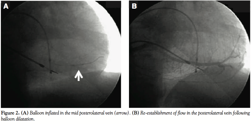Conclusion. Cardiologists need to be aware of unusual technical challenges that they may encounter while implanting a bi-ventricular pacing device. Excessive catheter or guidewire manipulation may lead to vasospasm of the CS or its tributaries. Such cases may be successfully managed by direct injection of NTG or performance of balloon angioplasty using regular angioplasty balloons.