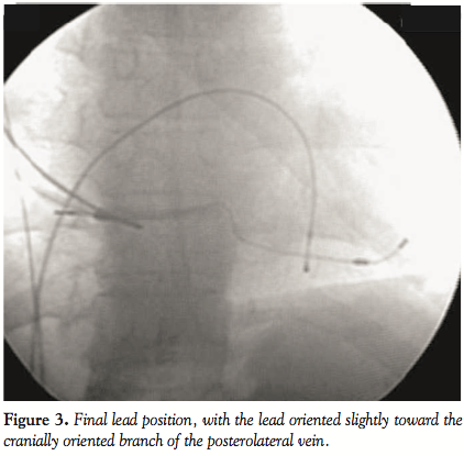 Though the target vein in our case appeared straightforward, it divided into two terminal tributaries, one angulated cranially and the other caudally toward the diaphragm. Expectedly, attempts at placing the lead in the lower subdivision resulted in diaphragmatic stimulation. Though placement of the lead in the cranially oriented tributary revealed acceptable parameters without any diaphragmatic stimulation, it got dislodged while withdrawing the long sheath. Possibly, since the caliber of this tributary in its distal part was not adequate to accommodate the entire distal tip, and the lead could only be partially wedged into this vein, during sheath withdrawal, the weight of the lead dragged it down into the main PL branch.