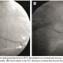 The CS was recannulated, and while attempting to pass the pacing lead in the PLV, severe resistance was encountered; the lead could not be passed beyond the mid portion of the PLV. Contrast injection revealed severe spasm in the vein with no distal flow beyond the mid PLV (Figure 1B). When repeated injections of nitroglycerin (NTG) failed to restore flow, we decided to perform balloon angioplasty of the vein to restore flow. Low-pressure (4–6 atm) dilatations were performed using a 3.0 x 12 mm Sprinter balloon (Medtronic Inc.) after which flow was restored (Figures 2A and 2B). The cranially oriented tributary of the PLV was also dilated, and this time the lead could be easily placed in this vein, with acceptable parameters, without any diaphragmatic stimulation (Figure 3).