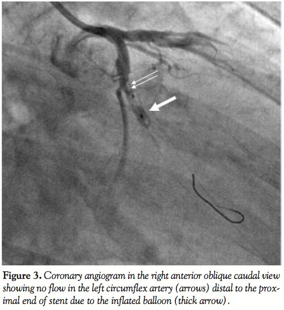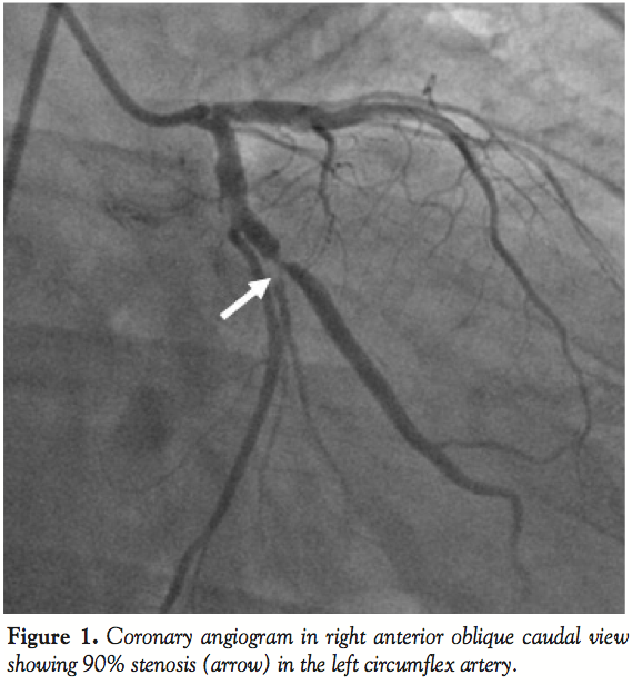 Case Report. A 65-year-old, diabetic male patient presented with inferior wall myocardial infarction (MI) and intractable post-MI angina. Coronary angiogram demonstrated significant double-vessel disease in the left circumflex (LCX) (Figure 1) and right coronary artery (RCA). He was taken for percutaneous transluminal coronary angioplasty with stenting to the LCX. The left coronary artery was engaged with a Judkins left guiding catheter (GC) (Medtronic Vascular, Santa Rosa, California). The lesion was crossed with a Stabilizer Plus