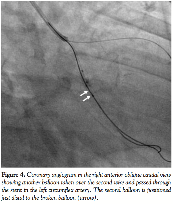 wire (Cordis Corporation, Miami Lakes, Florida) and predilated with a 2.5 x 10 mm Firestar balloon (Cordis Corporation). Residual stenosis was treated with a 3.5 x 13 mm Pronova drug-eluting stent (Vascular Concepts, Bangalore, India). Following stent deployment, incomplete expansion was noted in the mid-portion of the stent. A new 3.5 x 10 mm Firestar balloon (Cordis Corporation) was prepared and placed in the stented segment of the artery for in-stent dilatation. On attempting to inflate the balloon, we realized that the balloon was inflating predominantly in its distal portion (Figure 2). Thus, a negative suction was applied on the balloon catheter to deflate it. However, the distal portion of the balloon did not deflate. We tried to repeat the inflation and deflation of the balloon multiple times after diluting the contrast in the inflation device, but the balloon failed to deflate. Gentle traction was given on the shaft of the balloon while maintaining the negative suction, thinking that the partially inflated balloon might come out. While traction was applied, there was no movement of the balloon within the stent. Subsequently, the shaft of the balloon came out, while the partially inflated balloon was at its original position within the stent. This confirmed that the shaft of the balloon catheter had broken. The patient developed severe chest pain with ST-segment elevation along with hypotension. Angiogram revealed an occluded LCX starting at the inlet of the stent (Figure 3). The LAD also showed TIMI-2 flow. We quickly wired the LAD to maintain the access, anticipating a later thrombogenic complication in the same. An additional 2,500 U of unfractionated heparin were also given. The cardiac surgery team was alerted and surgical retrieval of the entrapped system was planned. In the meantime, a Whisper wire (Abbott Vascular International, BVBA, Belgium) was maneuvered through the stent with difficulty and positioned in the distal artery (Figure 4). Anticipating that a sufficient length of the shaft of broken balloon had been retained inside and was extending into the GC, a 2.5 x 9 mm Maverick balloon (Boston Scientific, Natick, Massachusetts) was advanced over the second wire and positioned near the tip of the GC and inflated to 14 atm so that the proximal part of the broken balloon shaft was trapped between the outer wall of the inflated balloon and inner wall of the GC. A gentle attempt to withdraw the assembly failed to show any movement of the assembly. The balloon was quickly withdrawn. A 2 x 9 mm Maverick balloon was negotiated with great difficulty through the stent on the second wire alongside the partially inflated broken balloon (Figure 4). The balloon was quickly inflated to 5 atm and withdrawn to position it just
