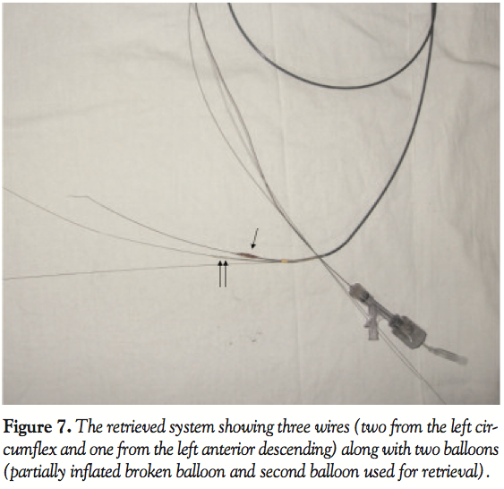 distal to the entrapped inflated broken balloon. Gentle traction on the distal balloon showed gradual withdrawal of the whole assembly (GC with three wires and two balloons over it). Continuous traction was maintained, which resulted in retrieval of the inflated broken balloon along with its shaft out of the coronary system and circulation (Figure 5).