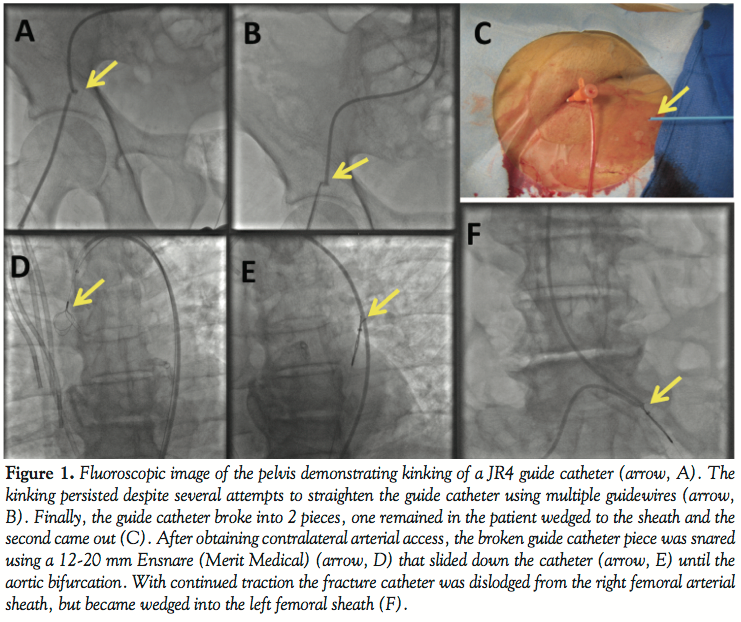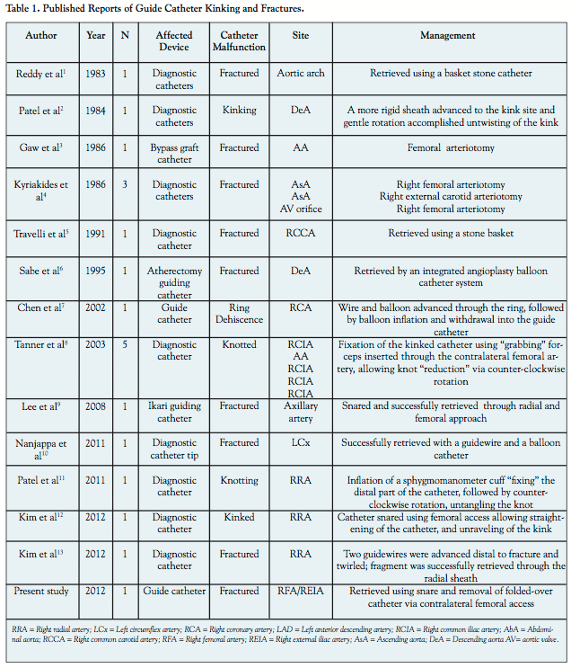 Kinking of the guide catheter is an infrequent complication that usually resolves easily after inserting a guidewire through the kinked segment (Table 1). We describe a case in which guide catheter kinking resulted in guide catheter fracture. The entrapped guide catheter fragment was successfully snared and retrieved in a “folded-over” configuration through contralateral femoral access.