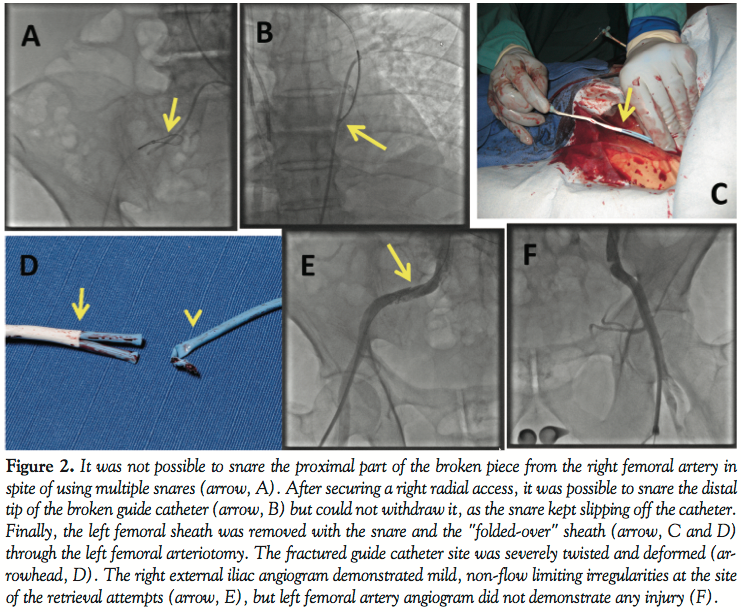 In our patient we snared the entrapped guide catheter fragment from the contralateral groin, but could not snare its distal or proximal tip. We removed the “folded over” catheter from the contralateral groin, cut the catheter and inserted a 0.035 guidewire through it to maintain arterial access while the catheter fragments were removed. This maneuver carries the risk of arterial access injury as it involves pulling the folded over catheter through the arteriotomy site; however, a 9 Fr sheath successfully obtained hemostasis and iliac angiography at the end did not demonstrate any injury.