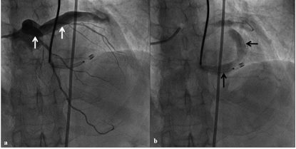 Using these criteria, coil embolization was possible in only 37% of the fistulas. Small residual or recurrent leaks have been seen in <10% of patients treated by catheter techniques.9 A variety of complications have been reported following percutaneous closure of CAFs, including coil migration,10 ST and T-wave changes, increased cardiac enzymes (creatinine kinase), right bundle branch block,8 arrhythmias,10 and entrapment of the guidewire.