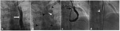 Figure 3. Selected images demonstrating device deployment. (A) Left internal jugular venous injection shows left superior vena cava (thick white arrow). (B) Exchange guidewire (black arrowheads) was exteriorized by using a goose-neck snare (white arrow), thus forming the arteriovenous loop (black arrowheads). (C) A Cook sheath was introduced over the guidewire and injection via sheath opacified the coronary sinus end of fistulous tract. (D) The device was deployed at the narrow neck just before it drains into the coronary sinus (click thumbnail to view larger image).