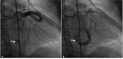 Figure 4. Immediate postprocedural coronary angiogram. Right anterior oblique cranial projection showed the device in situ (white arrows) without any residual shunt and normally filling branches of the left circumflex artery in the early (A) and late phase (B) (click thumbnail to view larger image).