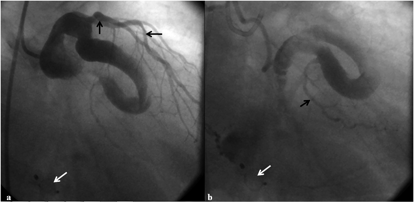 Figure 2. Selective left coronary angiogram in right anterior oblique cranial projection revealed aneurysmally dilated left main and circumflex coronary artery (white arrows) in the early phase (A) and fistulous tract draining into coronary sinus (black arrows) in the late phase (B) (click thumbnail to view larger image).