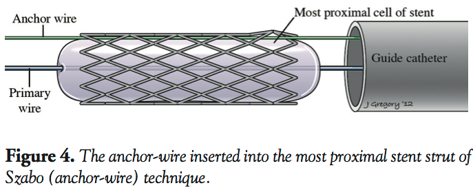 D. Szabo (anchor-wire) technique. In 2005, Szabo reported a method of using two guidewires to enable optimal coverage of the ostium.9,10 The guidewires are placed in the main branch and the side branch or in the aorta if an aorto-ostial lesion is being treated. Then, the stent is prepared by low-pressure inflation of the delivery balloon to raise the proximal cell of the stent outside the patient (Figure 4). The majority of the stent remains on the balloon and only the proximal cell is lifted from the delivery balloon. When the proximal end of the stent is seen to have lifted, the balloon is immediately deflated, leaving the proximal strut free. The proximal end of the guidewire positioned in the aorta or in the opposing branch is passed through this lifted stent strut and the stent is re-crimped on the delivery balloon. Gutierrez-Chico et al11 reported their experience with 78 patients with Medina (010 or 001) or aorta-ostial lesions. They report an angiographic success rate of 100%. Acute procedural success was 86%, and 30-day procedural success was 78%. They believe the Szabo technique was more accurate than the angiographic technique of stent placement in avoiding geographic miss. This belief was based on the evaluation of the final stent position by angiography alone.