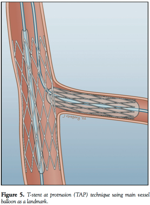 E. T-stent and small protrusion technique (TAP). The ostial stent is placed to fully cover the ostium of the side branch with a slight protrusion of 1 mm into the main vessel (Figure 5). Accurate placement is often aided by placement of an uninflated balloon in the main vessel. The ostial stent is inflated once it is in position. This technique can be utilized with a single ostial stent for side-branch disease or as a two-stent approach in bifurcation lesions. When used as a two-stent technique, the main vessel is stented first. The side branch is re-wired and the stent cell across the side branch is dilated to allow passage of a stent into the side branch. An uninflated balloon is placed in the main branch and the side-branch stent is brought back to allow for a small protrusion into the main branch. After deployment of the side-branch stent, the delivery balloon is pulled back into the main vessel and both the main-vessel balloon and the side-branch balloon are inflated to allow for a final.