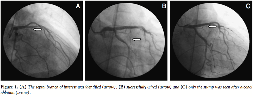 - Ziaee A, Lim M, Stewart R, Kern MJ. Coronary artery occlusion after transluminal alcohol septal ablation: Differentiating dissection, spasm, and alcohol-induced no reflow. Catheter Cardiovasc Interv 2005;64:204–208.