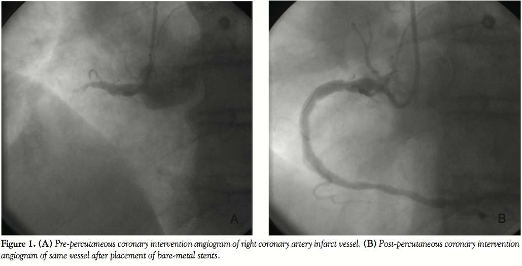 Case Report. A 75-year-old man with a history of hypertension presented to the emergency department on day 1 with inferior wall ST-elevation myocardial infarction (STEMI). He denied any prior cardiac history. He was taken directly to the cardiac catheterization lab for primary PCI. Angiogram revealed acute thrombosis within the right coronary artery (RCA), with 100% occlusion. PCI was performed within the infarct vessel, with placement of two bare-metal stents and reduction of the lesion to 0% residual stenosis and TIMI 3 flow in the distal vessel (Figures 1A and 1B).